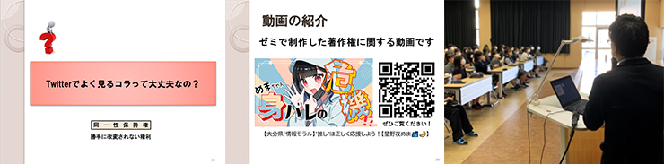 SNSと知的財産としては、「ゆっくり茶番劇」の商標炎上騒動についても触れられ、野田ゼミで制作した著作権に関する情報モラル動画も紹介されました。