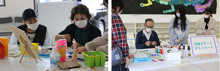 活動では地域の方と一緒に、指描きアートポストカード、絵しりとりポストカード、エコスタンプ巾着などを作りました。