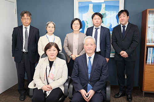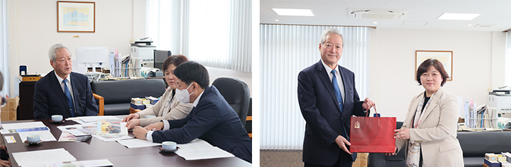 11月9日、本学学長室にて、釜山外国語大学 国際交流処長兼韓国語文化教育院長、韓国語教育学科教授 鄭明淑 (ジョン・ミョンスク)氏と、国際交流チーム鄭容官(ジョン・ヨンガン)氏がご来学され、本学小手川大助学長と歓談しました。同大学からのご来学は約3年ぶり、小手川学長就任後初めてとなります。