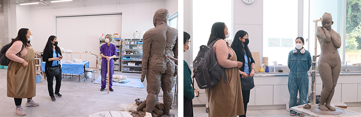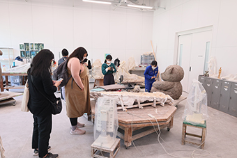 両氏は、学内美術棟で彫刻を専攻する学生が作業をする様子を見学し、学生に制作工程やコンセプトなどを質問していました。また、美術棟の様々な施設を巡り、「とても環境のいい施設だった。ここで制作をしてみたい」と感想を述べられました。