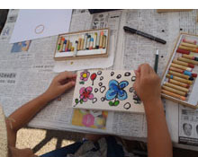 夏の暑い日差しの中、綺麗な花達と久住連山を眺めながらのロケーションで染色のワークショップを行いました。ちょっと暑すぎたせいか、人の入りは少なかったのですが、参加してくれた子ども達は楽しくお絵かきをしてくれました。