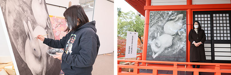 若宮八幡社(大分市上野町)周辺自治会から依頼を受け、専攻科造形専攻1年生(日本画専攻)の牟田望さんが、2023年の干支「卯」の絵馬を制作しました。絵馬制作にあたっては、自然動物公園アフリカンサファリに赴き、ウサギを様々な角度でスケッチしながら構想を練ったそうです。