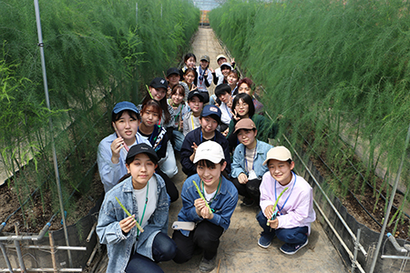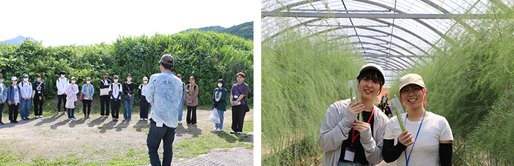 活動ではまず、ゆふいん市街の近くでアスパラガス生産を行う衞藤将明氏(Genie's Farm代表)のほ場で、農業経営やアスパラガス栽培についてご説明いただき、収穫を支援しました。