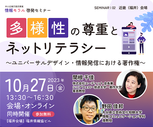 10月27日(金)、情報コミュニケーション学科の野田准教授が、中小企業庁委託事業「情報モラル啓発セミナー」に登壇し、情報発信における著作権リテラシーについて講演しました。
