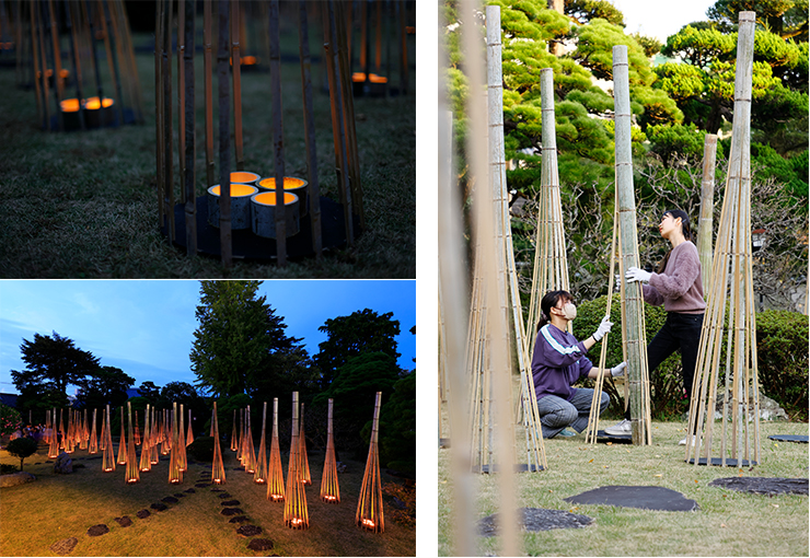 造形作品は長さ2.7Mの竹を一節残して16分割し、下にろうそくを灯しています。これにより、分割した竹の内側がろうそくのやさしいあかりで浮かび上がり、幻想的な風景を作り出します。配置は「うすき竹宵」のメインイベントである般若姫行列に登場する“般若姫”にゆかりのある京都をイメージし、京都の街並みと同様に厳格に東西南北碁盤の目に合わせました。