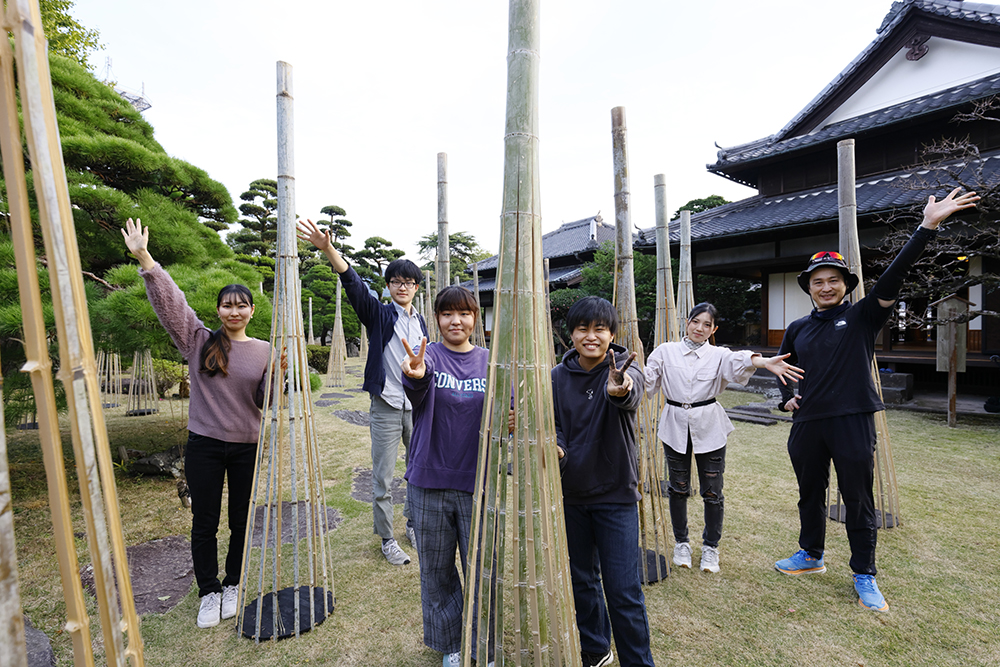 参加したのは短大1年生から専攻科2年生までの有志の16名。会場となった旧臼杵藩稲葉家下屋敷の庭園に、50本の竹の造形作品を配置し、庭園や屋敷の厳かな雰囲気と共鳴し合うように、シンプルかつダイナミックに空間構成しました。