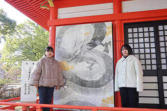 若宮八幡社(大分市上野町)周辺自治会から依頼を受け、専攻科造形専攻1年生(日本画専攻)の古川遥香さん、福留亜未さんが、2024年の干支「辰」の絵馬を制作しました。