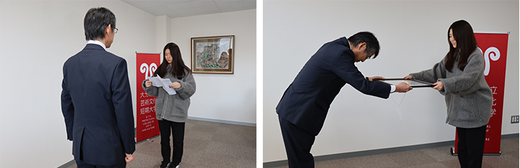 式典では冒頭、安藤善之 事務局長からサービスラーニングとして募金活動に参加した学生へ労いの言葉が述べられ、学生を代表し、情報コミュニケーション学科1年の徳永 尚さんが、今年度の募金、計148,845円の目録を、大分県共同募金会の代表者に手渡しました。