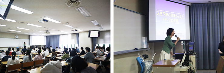 5月31日(金)2限の共通教育科目「時事ニュース研究」では、日本テレビで活躍する気象予報士・藤森涼子さんが、「天気予報の変遷」をテーマに授業を行いました。