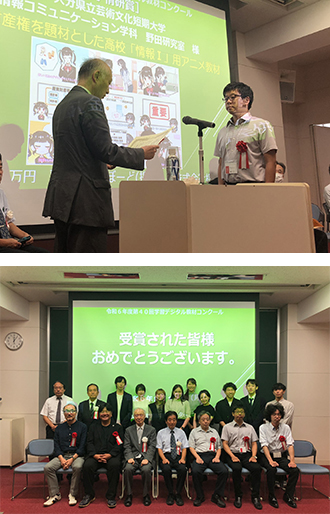 情報コミュニケーション学科・野田研究室の学生たちが主体となって制作したアニメ教材「【情報Ⅰ】お姉ちゃん教えて!産業財産権ってなに!?」が、公益財団法人学習情報研究センターの「令和6年度学習デジタル教材コンクール」で「学情研賞」を受賞し、8月19日に行われた表彰式で賞状・賞金・副賞が授与されました。