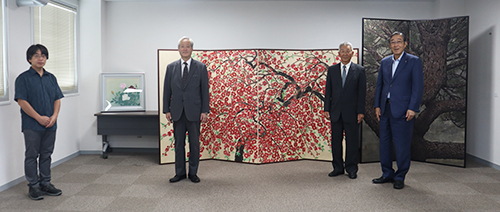 寄贈式には、平野画伯の甥・河野淳 氏、フンドーキン醤油株式会社 代表取締役社長・小手川強二 氏、小手川大助 学長、美術科・永井学 准教授が出席しました。