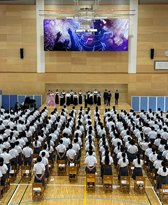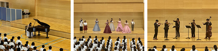 本学音楽科、専攻科音楽専攻の学生たちが、オペラハイライト、ピアノソロ、弦楽アンサンブル、木管五重奏、金管五重奏、合唱などを披露しました。また、最後には児童・生徒の皆さんと一緒に校歌を歌いました。