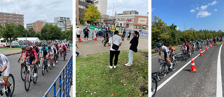 このイベントで、学生は来場者へのアンケート調査を主に担当し、主催者が用意した内容である来場者の居住地、イベントでの飲食費、交通費、土産代などを聞き取りました。最初はなかなか声をかけることができませんでしたが、次第にレースの周回などのタイミングに声をかけることができるようになっていきました。