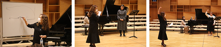 本学学生をはじめ、一般の方など多くの聴講者が見守る中、専攻科音楽専攻声楽コースの学生らが個人レッスンを受けました。世界的に活躍するプリマドンナの指導に、レッスンを受けた学生はもちろん聴講者も、真剣な表情をして耳を傾けていました。