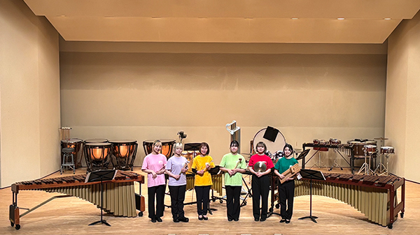 本学音楽科で打楽器を専攻する学生の有志で結成したパーカッショングループ「ミレニアム」。1999年に設立され、本学音楽科・専攻科音楽専攻の打楽器専攻の学生が企画・運営・演奏まで一丸となって取り組んでいる打楽器アンサンブルグループです。昨年の第25回コンサートより曽根千夏非常勤講師が指導を行っています。