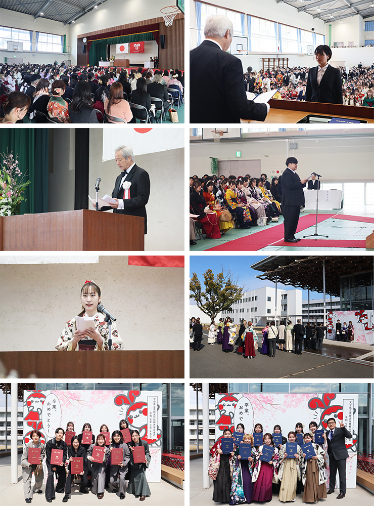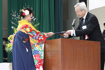美術科91名、音楽科58名、国際総合学科104名、情報コミュニケーション学科107名の計360名に卒業証書と学位記が授与され、専攻科造形専攻23名、音楽専攻24名の計47名に修了証書と学位記が授与されました。また、芸術系2学科で教職課程を修了した学生に対して、教員免許状(中学校教諭2種:美術13名、音楽28名)が授与されました。