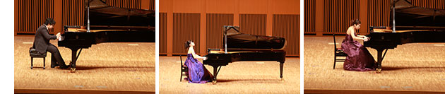 ピアノソロの6名は、各学年の成績優秀者で、バロック期のバッハ「平均律クラヴィーア曲集」から始まり、ベートーベン、ショパンのピアノソナタ、続いてドビュッシー、ラフマニノフの作品、そして現代曲のプーランクまでと幅広い分野の作品を取り上げており、バラエティに富んだ演奏になりました。第1部の最後には、専攻科生2名による連弾の演奏で、ラヴェルの「マ・メール・ロア」が取り上げられ、「眠りの森の美女」など童話の世界がピアノで描き出されました。