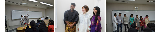 午前中は交流会を開き、国際総合学科の学生3名が「日本の文化、大分の文化」についてのプレゼンテーションを行い、英語で日本の四季折々の文化と大分のイベントや名物を紹介しました。インドの大学生からは、インドの伝統の歌や踊りの披露がありました。その後、約30名の本学学生とインドの大学生がお互いの国の印象などについて、楽しくディスカッションをしました。