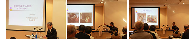 12月7日、有元展の最終日には、本学学長の中山欽吾の講演会が市美術館研修室で行われました。中山学長は、有元氏と同じく音楽と美術の両方の分野に通じており、また旧来から有元絵画の熱烈なファンということで、今回の講演会となりました。表題は『音楽を奏でる絵画』。
