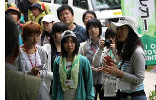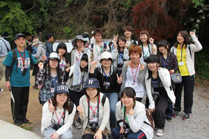 この日は、本学学生27名がサービスラーニングで参加、写真撮影や記念品配布のお手伝い、ゴミ拾いなどを行いました。登り口に設置された周辺案内地図板は、昨年卒業した学生が、コース周辺の見所や名所の調査を行い、マップを作成、表示板として採用されました。