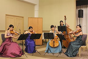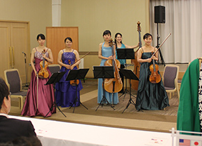 第25回日米草の根交流サミットおおいた大会の開会式が7月8日(水)、別府市の別府杉乃井ホテルで行われました。日米の多くの市民が参加し、開式までの間、にぎやかに会話を楽しみ交流を深めていました。歓迎演奏として、本学の卒業生と講師の5人が弦楽アンサンブルを披露しました。日米それぞれの市民になじみのある楽曲の弦楽アンサンブルに、人々は興味深そうに写真を撮ったり近くで鑑賞したりするなど、思い思いの形で開会式アトラクションを楽しんでいました。