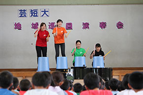 日出町立川崎小学校で9月10日(木)、地域巡回演奏会を開催しました。本学音楽科学生ら39名が全校児童、教員、地域住民ら約400名を前に、オペラハイライト・ピアノソロ・打楽器アンサンブル・金管5重奏・女声合唱を披露しました。