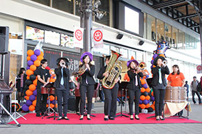 ステージは迫力あるファンファーレで始まり注目を集めました。そして間髪を入れずに始まった打楽器による「Greetings to Hermann」(ハーマンへの挨拶)、バケツを楽器にした「Stickin` Garbage」。軽快でキレの良い打楽器の演奏が秋空の下に響き、それを耳にした人がたくさん周りに集まってきます。仮装してバケツをたたいている姿を撮影する人も。そして金管五重奏による「A列車で行こう」、「汽車メドレー」、「となりのトトロ」の演奏では楽しくワクワクするような音楽に、多くの人々が足を止め聴き入っていました。フィナーレは「銀河鉄道999」。スピード感のある演奏にステージ周辺からは拍手が上がりました。