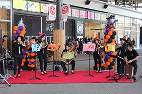 大分駅で10月31日(土)に開催されたハロウィンイベントで、音楽科と専攻科の9名の学生が仮装して演奏を披露しました。ステージは人通りの多い、大分駅北側。ハロウィン当日とあって、多くの人々が思い思いの仮装をしていました。学生たちも魔女の帽子やモンスターのかぶり物を身につけ、会場を盛り上げました。