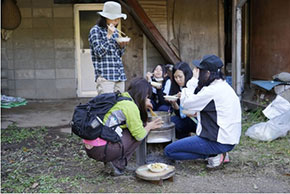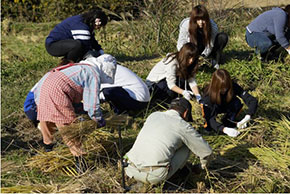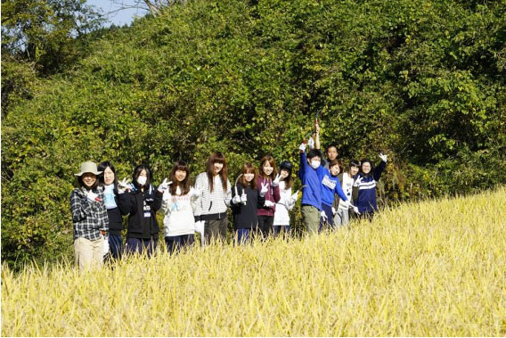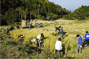 11月4日「地球のなかの小ちゃな田ノ口」で稲刈りやってきました。情報コミュニケーション学科の学生1年9名と2年4名が参加。大分市野津原田の口地区は戸数12戸(うち1戸空き家)、人口20人(うち65歳以上17人)という小さな集落。美しい自然にめぐまれ、森林セラピーのコースづくりなどお手伝いをしています。今年、田植えをお手伝いした田の稲刈りに行ってきました。手作業で稲を刈り、稲をまとめてくくり、天日干しします。寒暖差の大きな棚田で天日干しした米は格別おいしいです。この日は、同じく野津原のクチナシの実で作ったパエリアを羽釜で炊いて、みんなでいただきました。途中、イノシシもひょっこり顔を出しました。