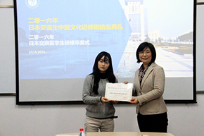 修了式では、1ヶ月の留学を終えた学生たちが、中国での勉強や生活について中国語で発表しました。その後、副学長の張英先生から修了証明書や成績証明書、記念品を贈呈されました。