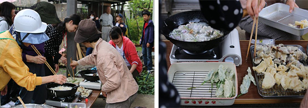 作業の後はお楽しみ会が行われ、作業の帰り道に集めた新鮮なお茶の葉、タケノコ、椎茸、藤の花、ツワブキなどの山菜を天ぷらにして、地域の人たちと森の話を聞きながら美味しくいただき、交流を深めました。