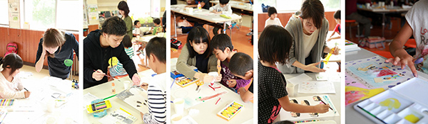 「地域ふれあいアート講座」は、本学の地域貢献活動の一貫として、2005年から毎年、県内各地の小学校を中心に取り組んでいるもので、子どもたちに創作の喜びや楽しさを味わってもらい、造形美術に対する興味や子どもたちの持つ感性を引き出すことを目的に行っています。