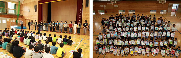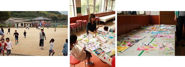 途中、学生たちと児童たちは給食を一緒に食べ、グランドで一輪車や鬼ごっこなどをして楽しい昼休みを過ごし、午後の作業で完成させました。