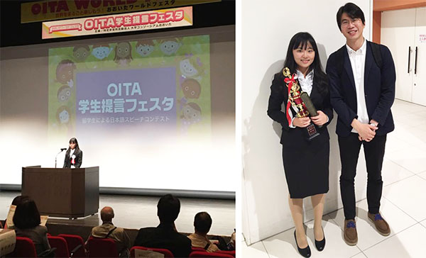 2016年10月29日(土)に、ホルトホール大分で開催された「OITA学生提言フェスタ ~留学生による日本語スピーチコンテスト」において、本学の留学生 周伊萱(しゅういかん)さんが、第2位(8人中)の成績を納め、優秀賞を獲得しました。