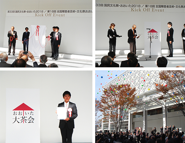 2018年に大分県で開かれる「第33回国民文化祭」と「第18回 全国障害者芸術・文化祭」の2年前を祝したキックオフセレモニーが、11月12日(土)大分県立美術館で開催され、大会テーマ「おおいた大茶会」のロゴマークが発表されました。
